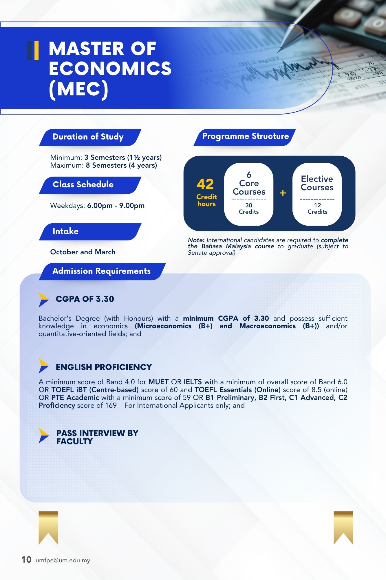 The programme is designed for those aspiring to hold positions requiring economic analyses and a high level of economic proficiency in business, industry and government. The programme provides its graduates with broad knowledge in a wide range of areas in economics. Students are also trained in conducting research to enhance their report writing and problem solving skills in areas related to economics necessary to be effective economic analysts.